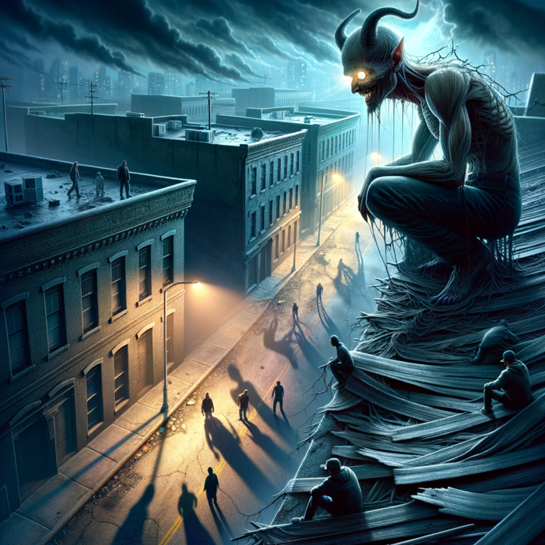 Scene: Bael stands atop a crumbling rooftop, overlooking a desolate street corner where rival gangs are about to clash. He intends to disrupt their confrontation by unleashing chaotic energies to dissuade further violence.