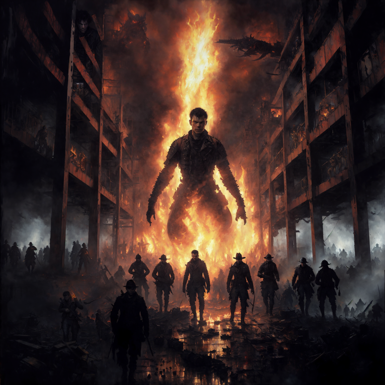 Scene: Azrael stands in an abandoned warehouse, cornered by a group of hostile humans armed with magically-enhanced weapons. With no other way out, she decides to use her power to transform into flame and escape through a ventilation duct.
