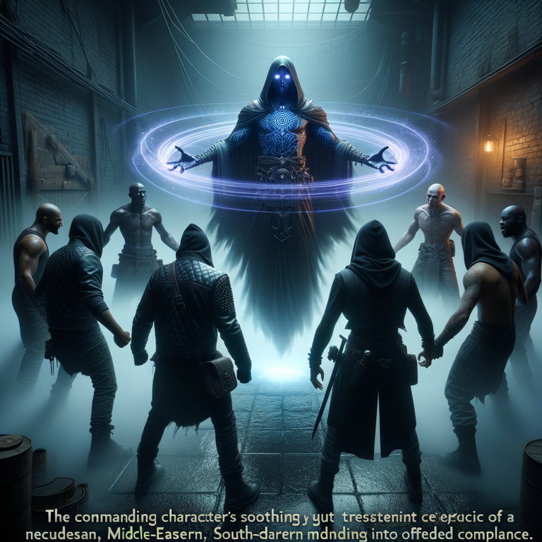 Azrael's commanding voice cuts through the chaos as he shouts, "Stay and fight! Defend your homes and families!" The five successes easily surpass the Wits scores of the townspeople, which average around 2-3. Instantly, the panicked crowd halts and transforms into a determinate group, ready to follow Azrael's commands. They arm themselves with improvised weapons, standing ready to protect the marketplace from the angelic threat.