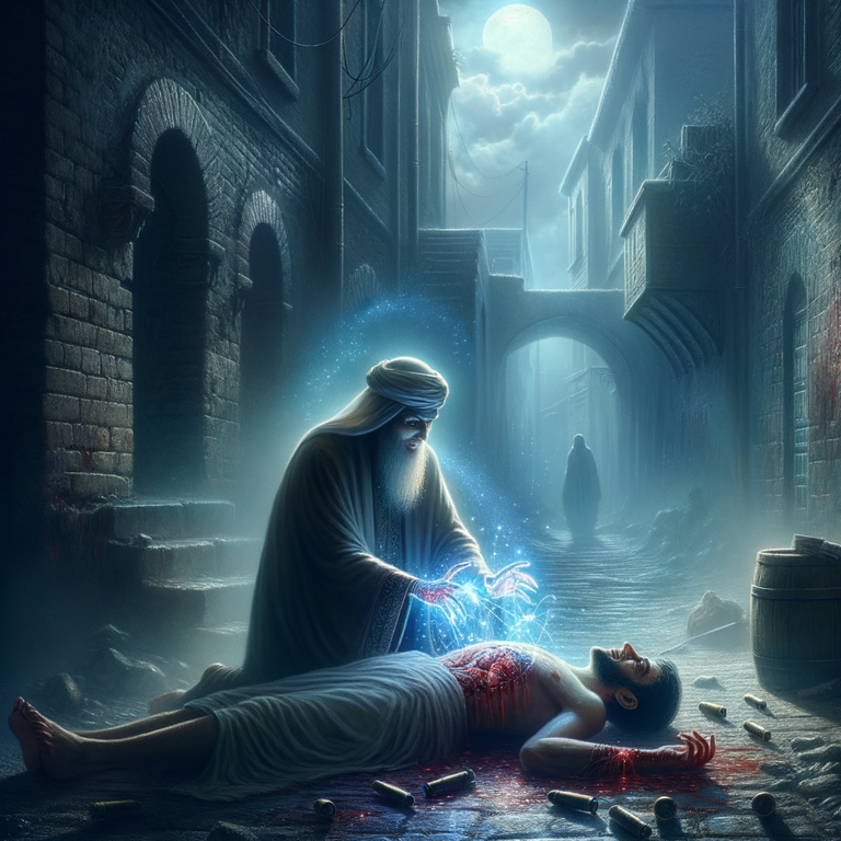 Scene: A grimy alleyway where Azazel finds a mortally wounded man, Jake, bleeding profusely from a brutal knife attack.