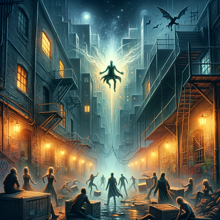Asheron channels his demonic power, feeling the gravitational pull on his body ease up. With a mighty leap, he clears a span of 80 yards, effortlessly landing on the next rooftop. The hunters, unable to keep up with his superhuman agility, quickly lose sight of him, allowing Asheron to make his escape. However, due to his monstrous nature, a wake of gravitational disturbances causes debris to lift and fall chaotically in his path, adding to the confusion and disarray behind him.