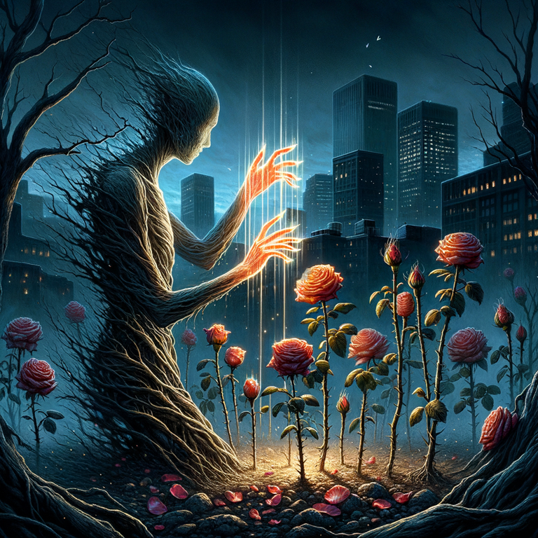With a quiet incantation, Azariah channels her otherworldly powers into the rose bush, spending one Faith point in the process. She feels the plant’s urge to grow twist under her control. The thick stems begin to creak and groan, rapidly extending and weaving together to form an impenetrable natural wall adorned with sharp, elongated thorns.